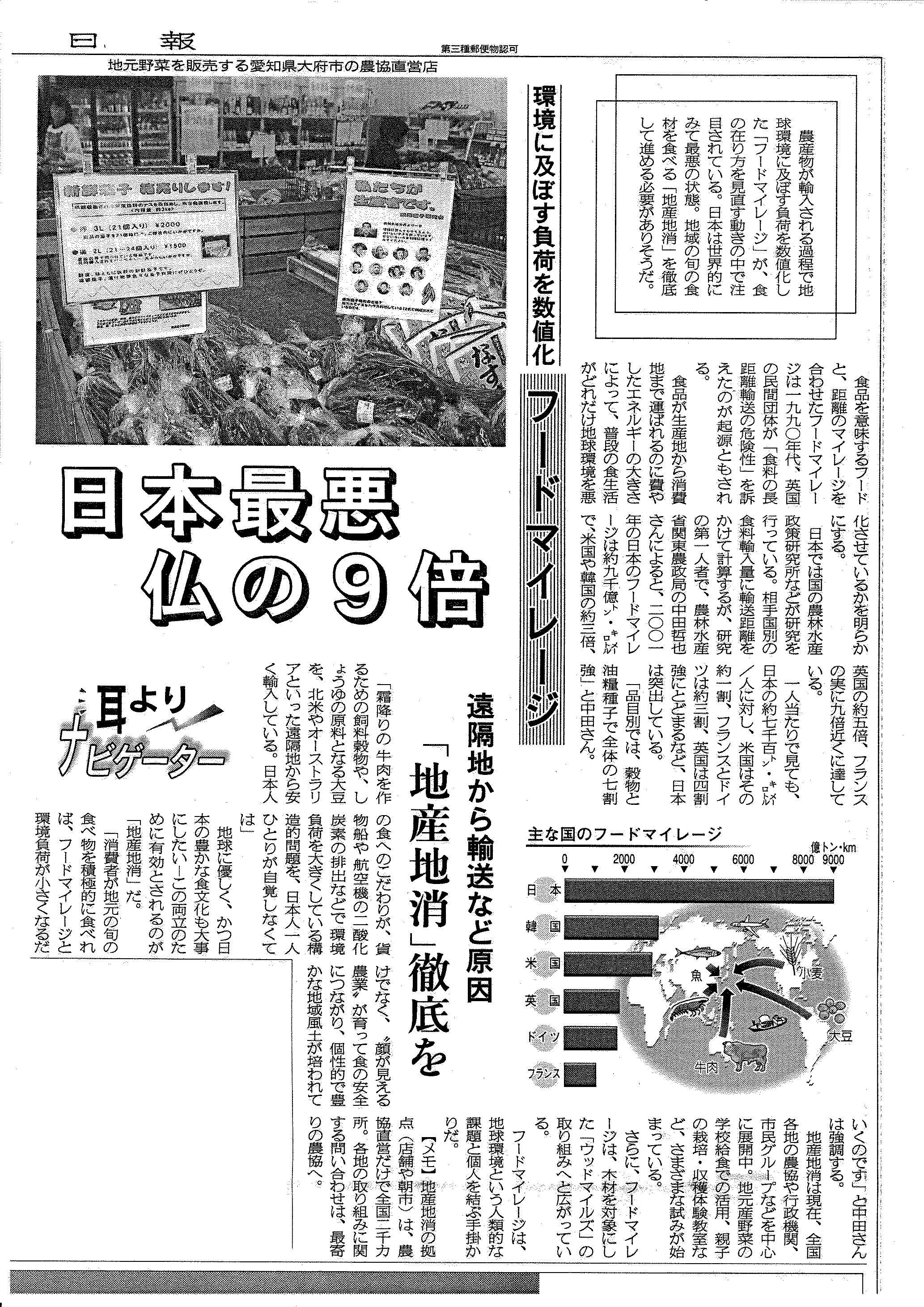 この結果によると、日本は世界的に高い数値(悪影響を与えている。)であり、記事中では日本のフードマイレージの第一人者である農水省の中田さんの言葉を引用し、日本人の食へのこだわりがどれほど環境に悪影響なのか、地産地消の普及の必要性が訴えられています。