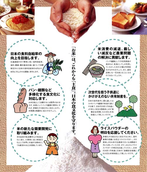 日本の自然条件に最も適したおコメをパンや麺類の粉食代替にする事で、